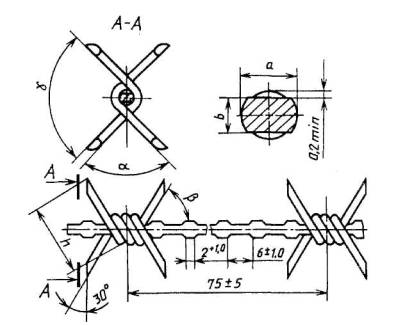 2.4. Концы шипов должны быть прямыми и острыми (угол заострения должен соответствовать указанному на чертеже). Допускается притупление и погнутость не более одного шипа на каждом метре колючей проволоки.