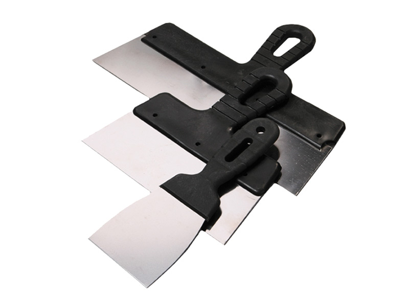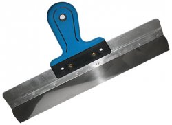 Малярный шпатель применяется для завершающей отделки поверхностей (выравнивание неровностей на поверхности, маскировка швов). Такой шпатель обладает трапециевидной формой, рабочая пластина изготавливается из нержавеющей стали, ширина в диапазоне от 80 мм до 450 мм.