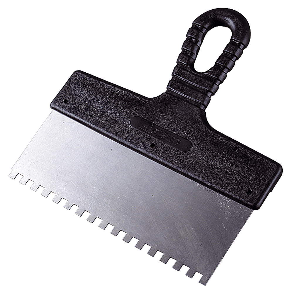 Зубчатый - применяется для нанесения клея на поверхности. В зависимости от вида клея подбираются зубцы. Например, для гипсового клея подходит шпатель с большими зубцами, для плиточного – зубцы поменьше, для жидкого клея – мелкие треугольные зубцы. Ширина рабочей пластины варьируется от 200 мм до 300 мм. Данный тип инструмента используется только на ровных поверхностях.